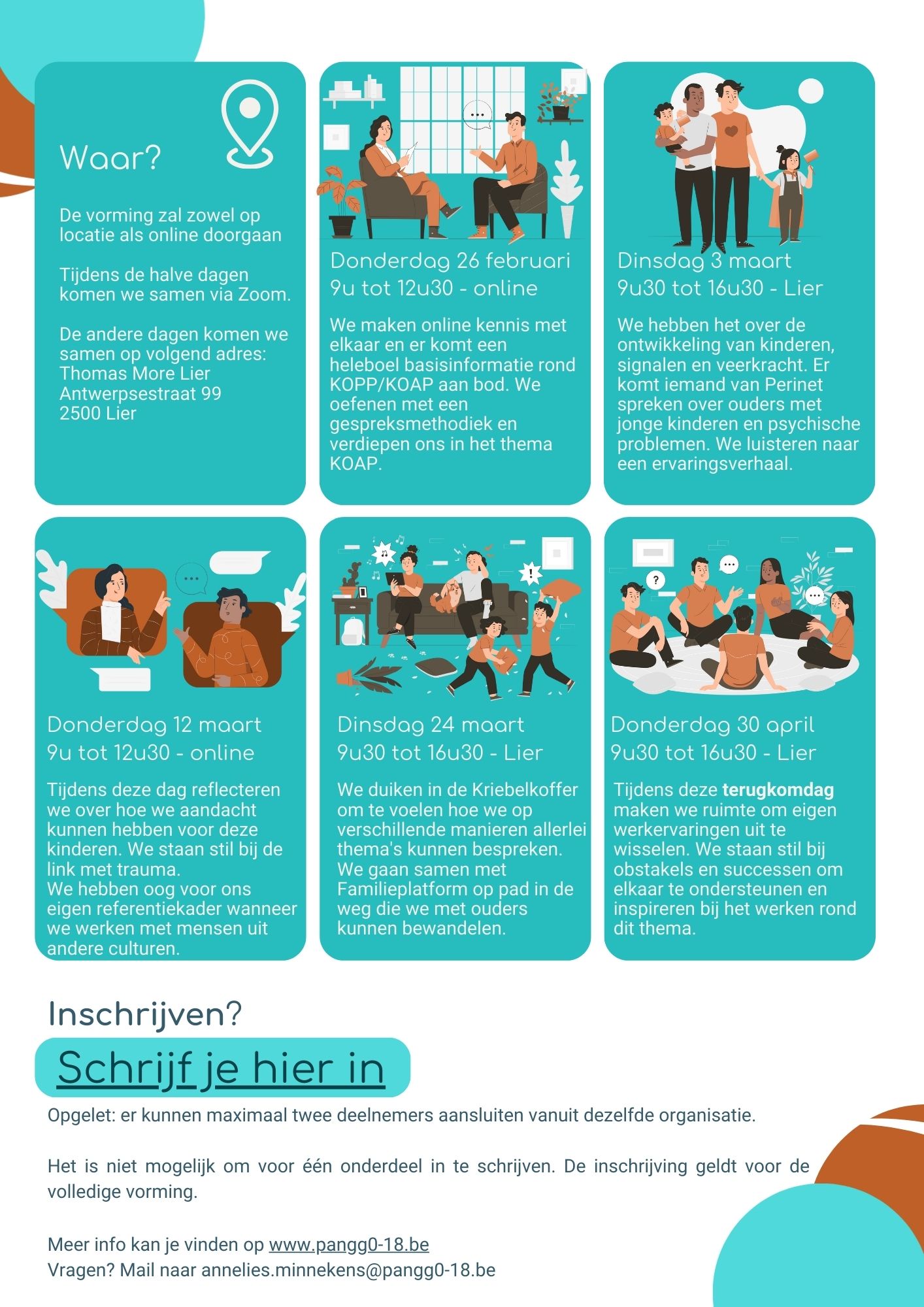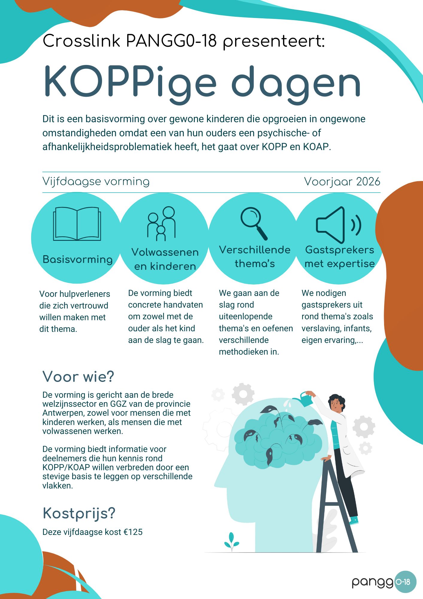 Vanuit Crosslink PANGG0-18 organiseren we KOPPige dagen. Dit is een basisvorming rond kinderen van ouders met psychische en/of afhankelijkheidsproblemen om hiermee aan de slag te gaan. Er worden concrete handvatten geboden om zowel met de ouder als met het kind aan de slag te gaan.